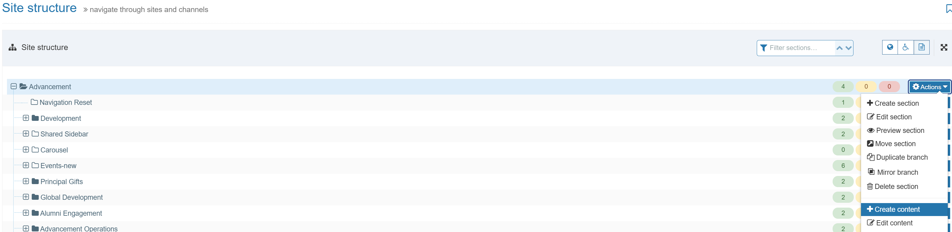 2. Click on the Actions button for the page that you wish to add content and select Create content from the menu;