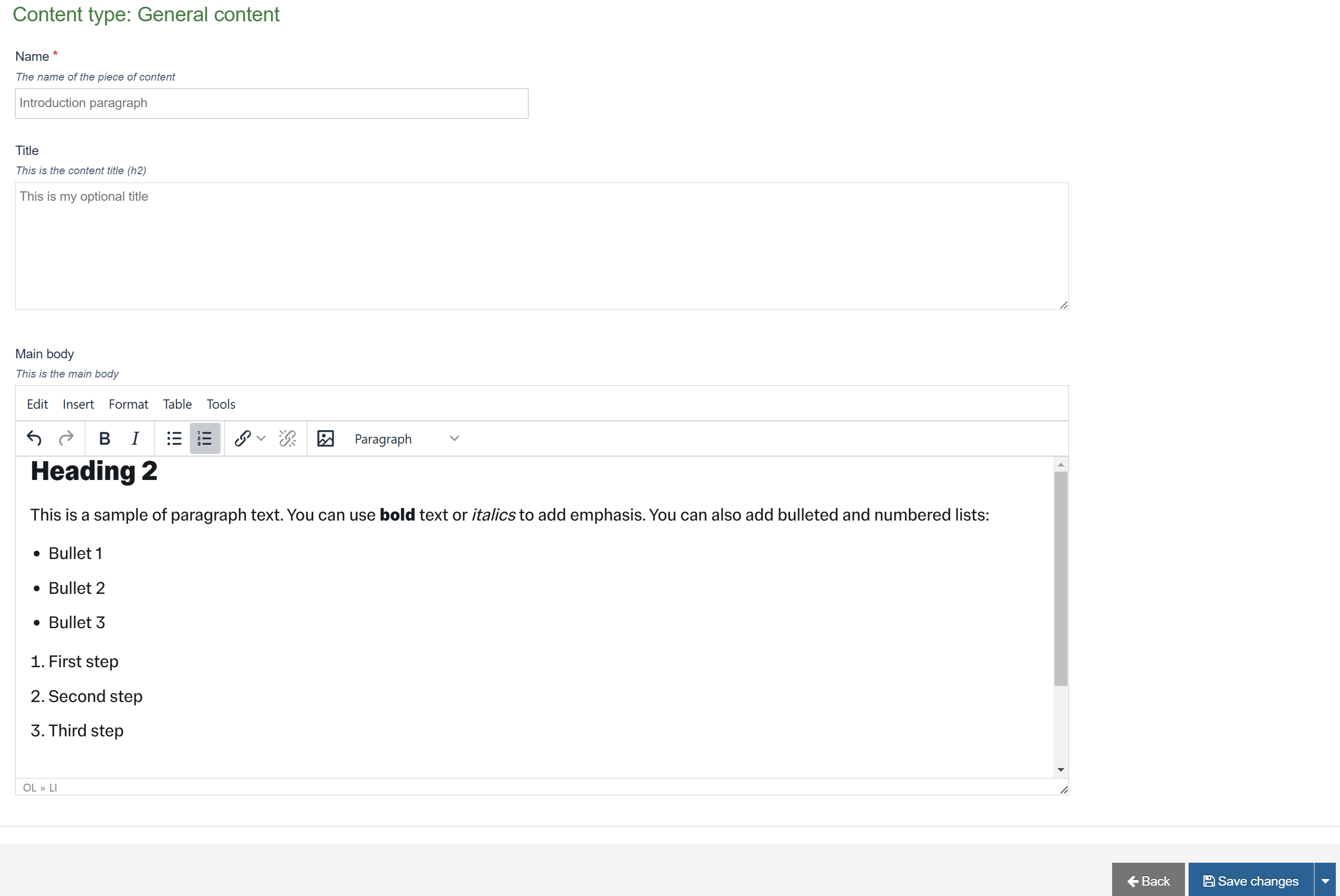 - Title - this field adds a Heading 2 above whatever content is added. In the 'general content' type, it is an optional field. You will find that it is mandatory in other content types;