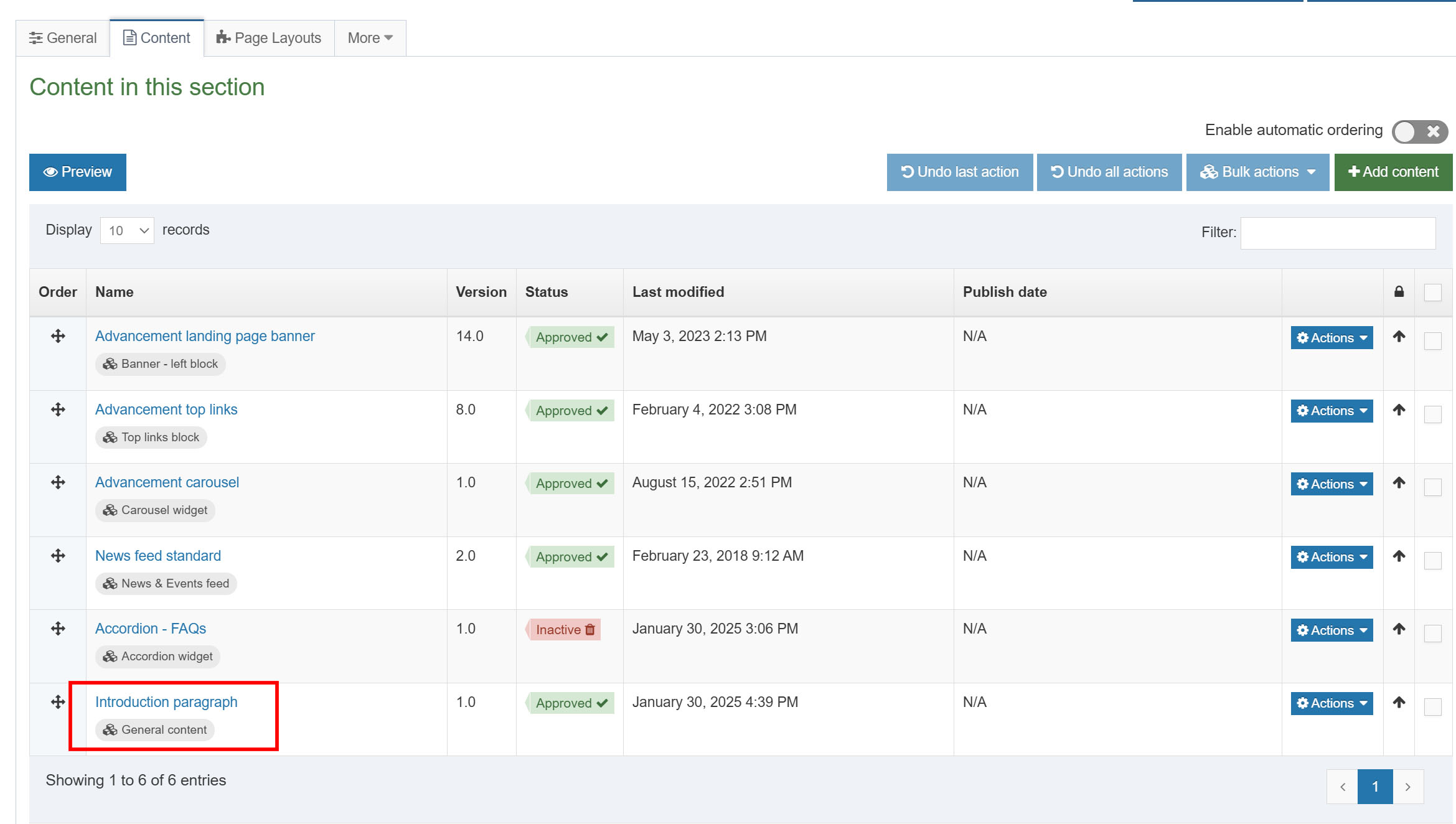 A new page opens, showing you the 'tabbed view', listing the content that is on that page. In this example, you can see the content I added as 'Introduction paragraph'. This view will list all the content type instances added to the page in the order they appear on the published page. Under the name of the content type you have added, you will also see the type of content it is. In this case a General content.