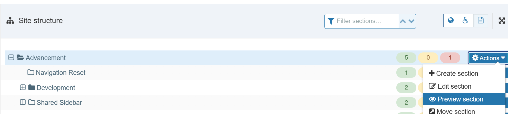 To view the content you added and approved, click the terminalfour logo in the top left of the screen to go back to the site structure, navigate to the page you just added content, click on the Actions button for that page, and click, 'Preview section'. A new browser tab will open showing the page with the content you added. See Previewing pages before they go live for more guidance on this.