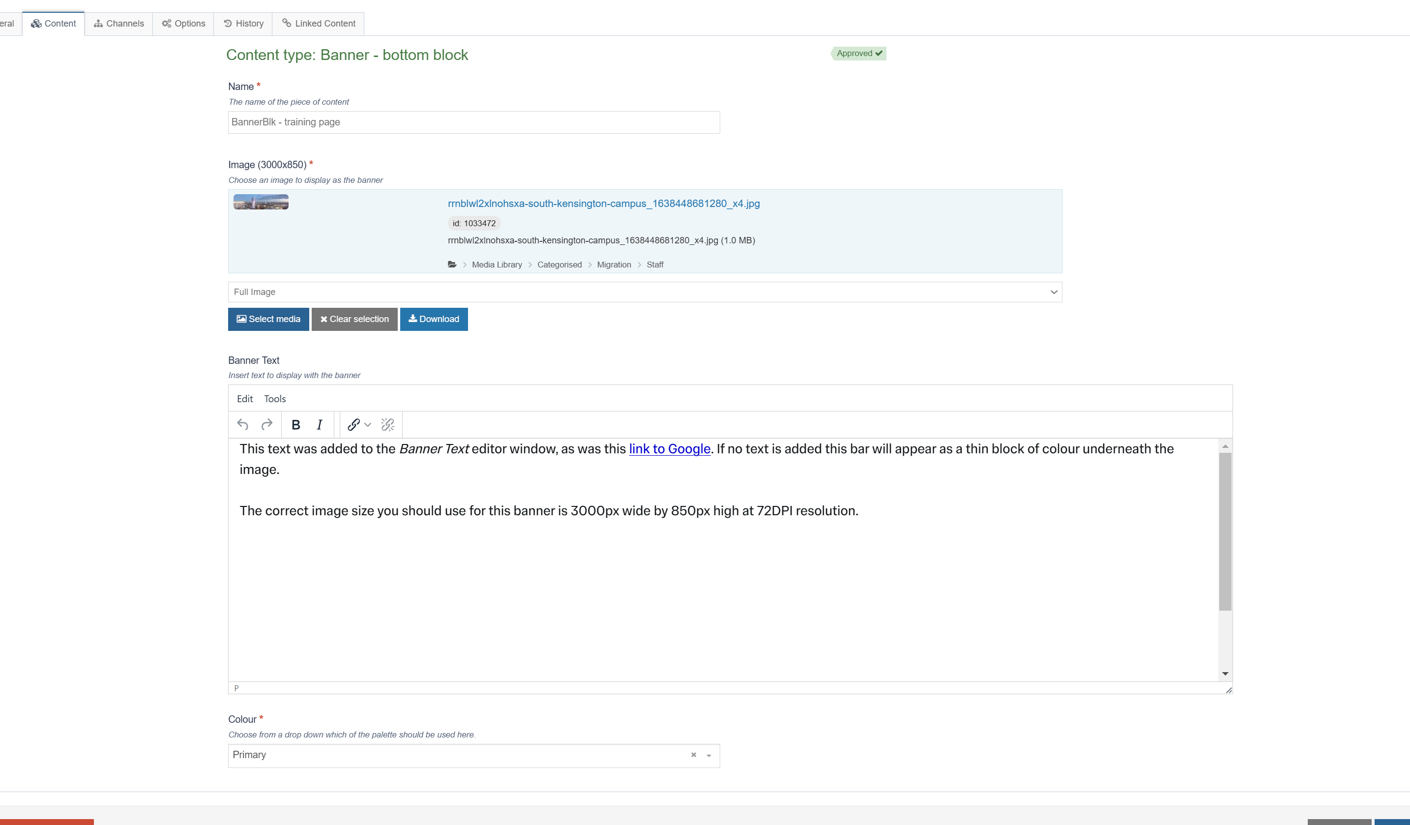 | New Banner image* | Click Select media to choose a image from the Media Library or to upload a new image. An image of 3000 pixels (wide) by 850 pixels (high) is required for this content type. Please view the guidance on adding and selecting images in the Media Library. | Yes |
