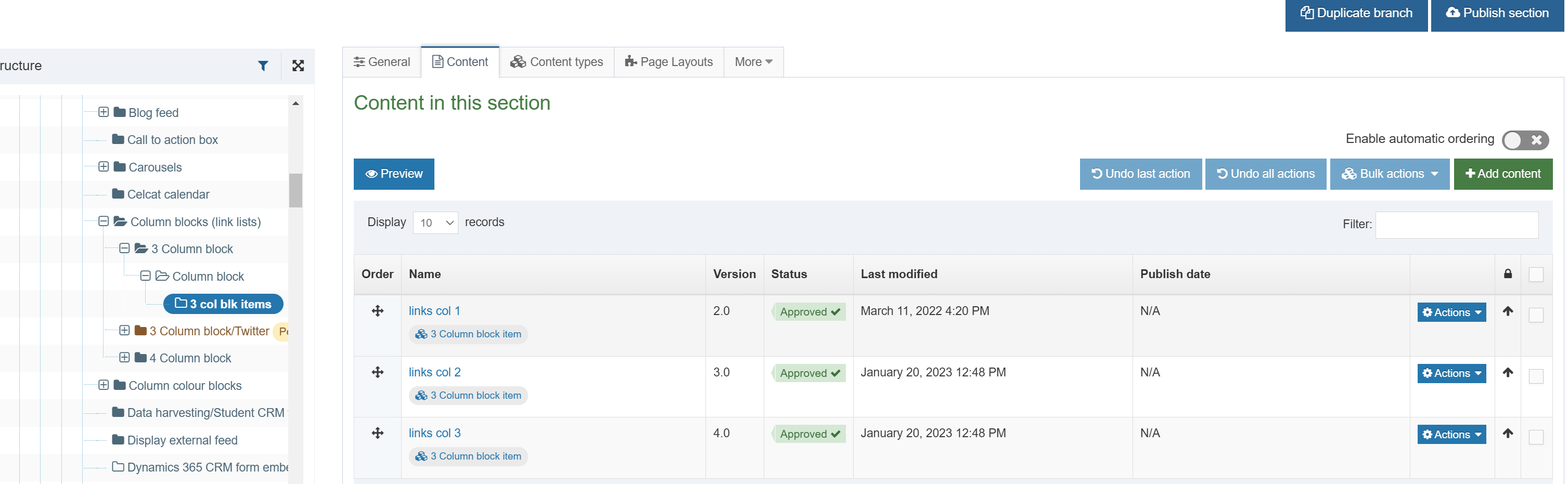 If a second set of 3 Column blocks is required on a page then another sub-section is needed and each column within the block will need a separate 3 Column block content type.