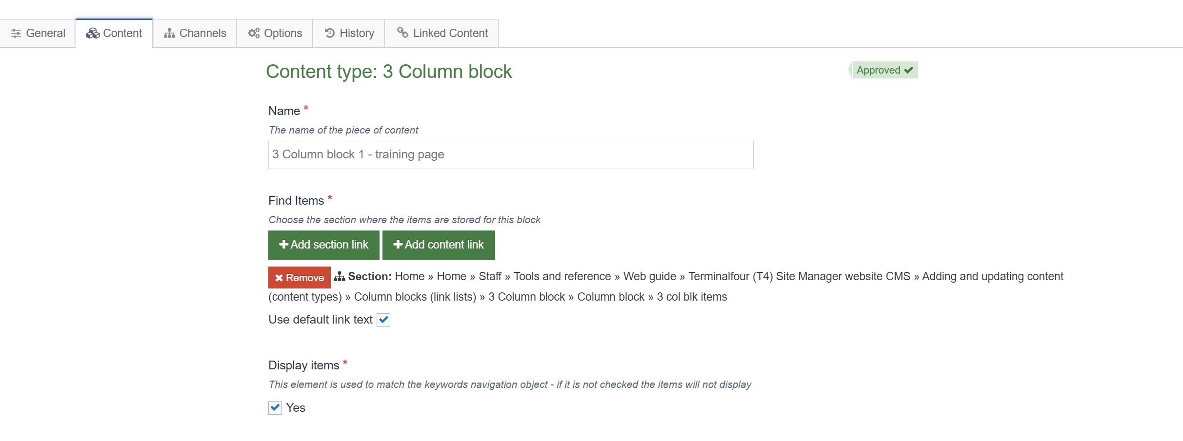 | Title Link Internal | Click Add section link if you want the column title to link to another T4 web page | No |