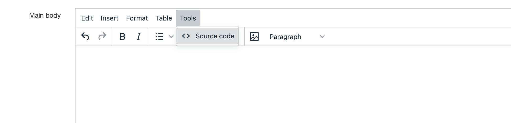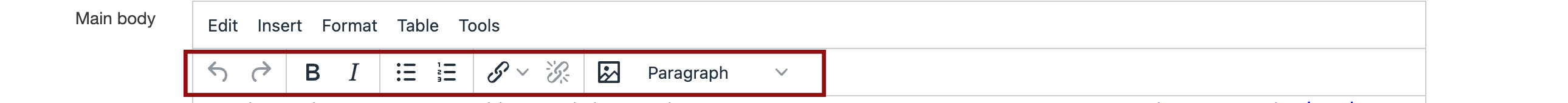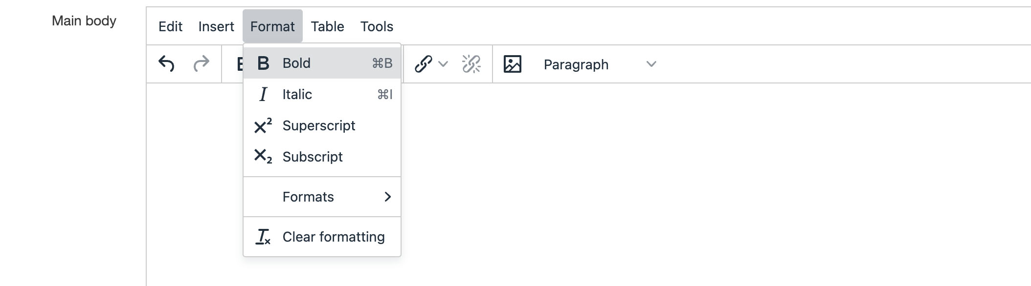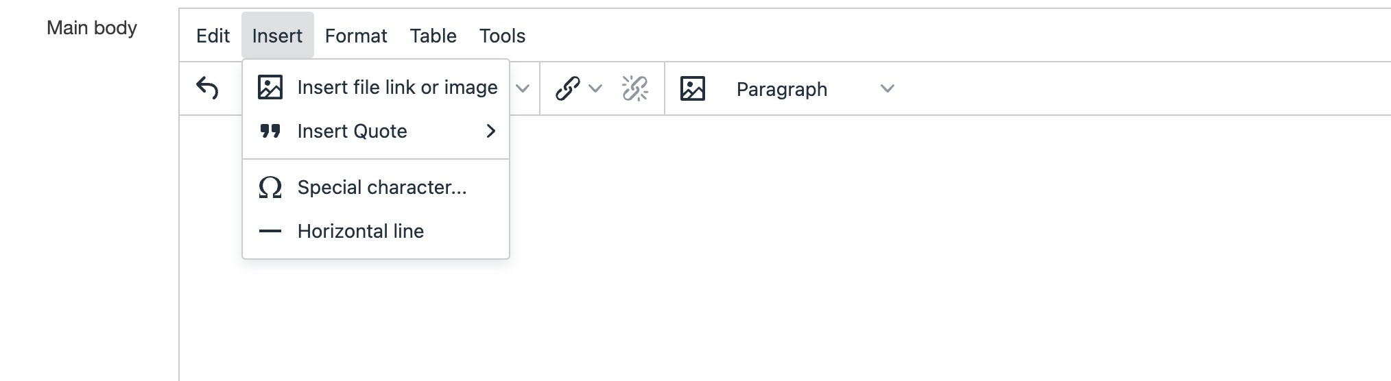 | Main body | This contains the text editor (see below) where you can add content, e.g. text, images, document links, etc., to the page. | Yes |