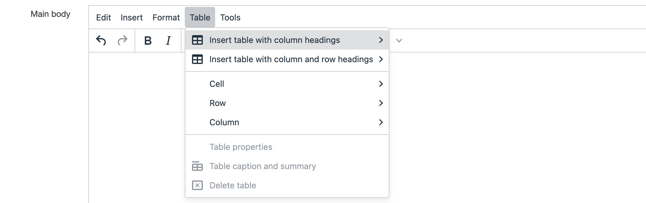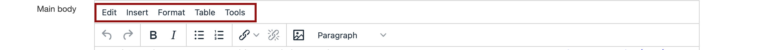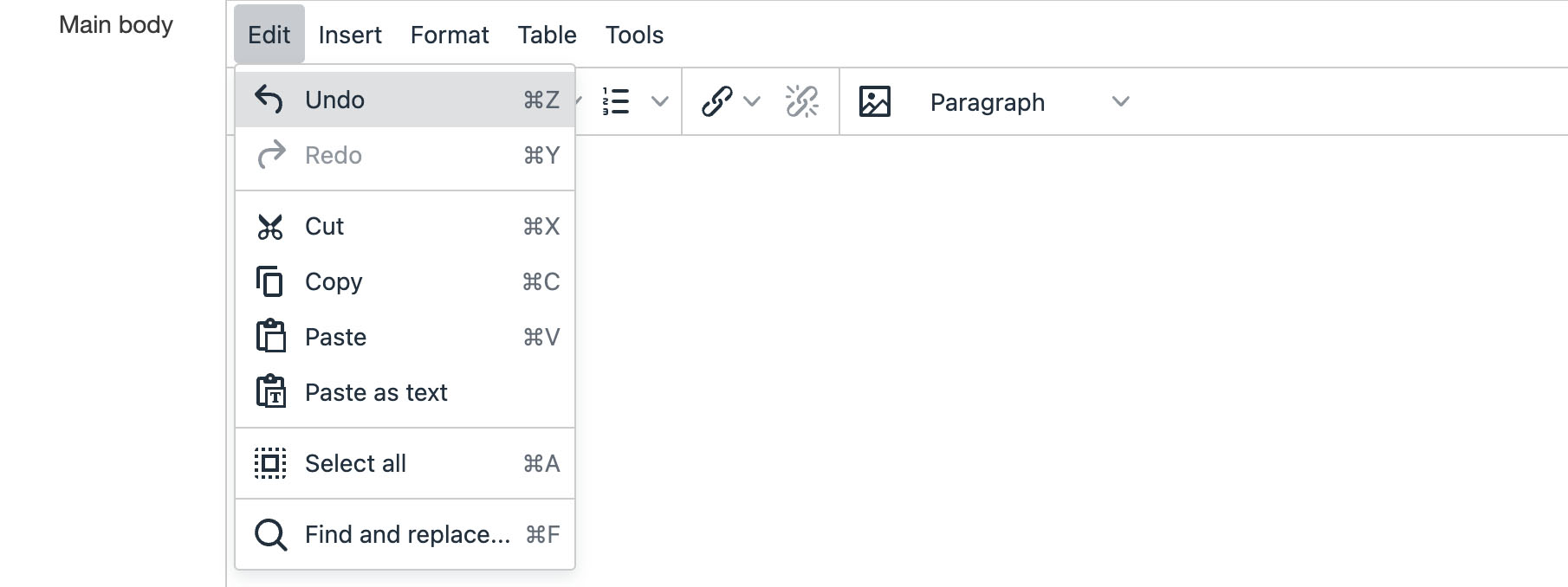 | Main body | This contains the text editor (see below) where you can add content, e.g. text, images, document links, etc., to the page. | Yes |