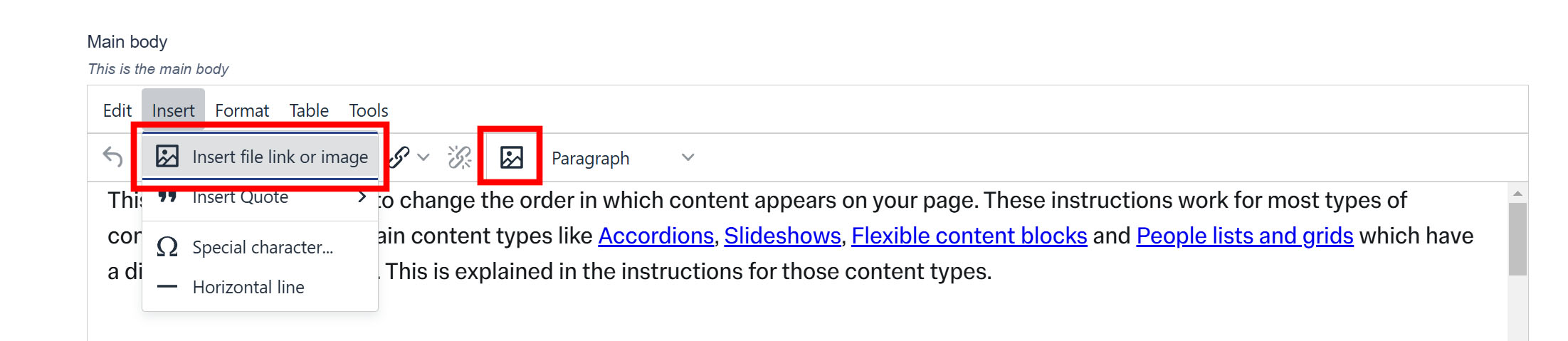 3. Click the Insert file link or image button or go to Insert > Insert file link or image in the menu. Both of these do the same.