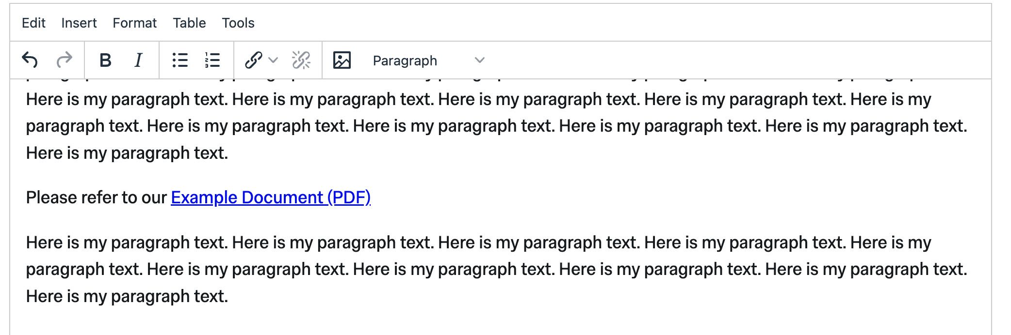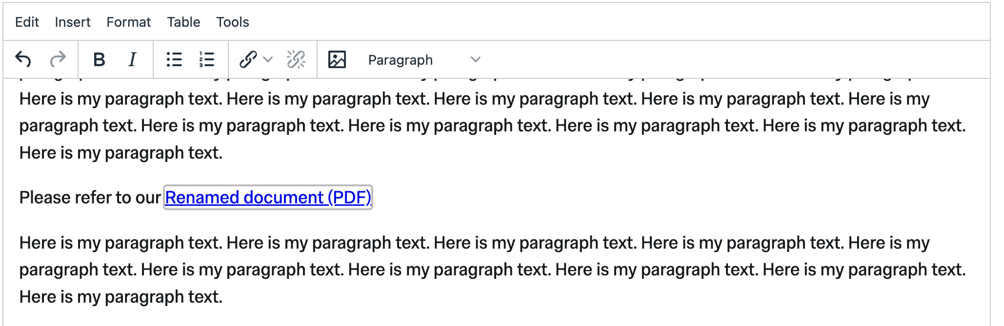 By default the link text will be the name of the document in the Media Library, but you can change this by double clicking on the link in the text editor and then entering your preferred link text in the Name field and clicking Ok. In this example I changed the default name from Example Document (PDF) to Renamed document (PDF).