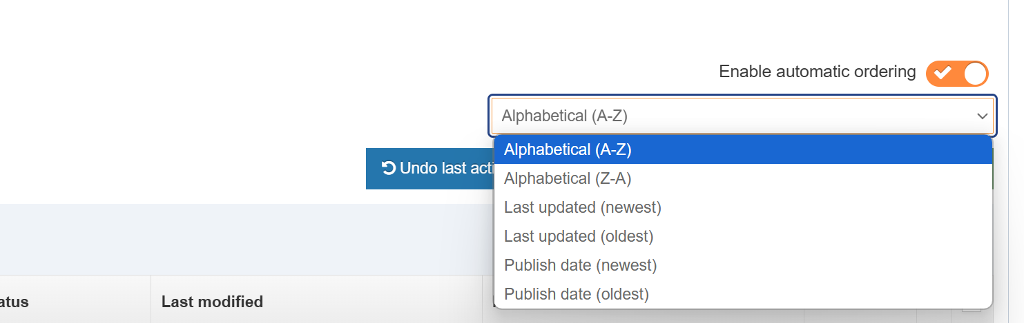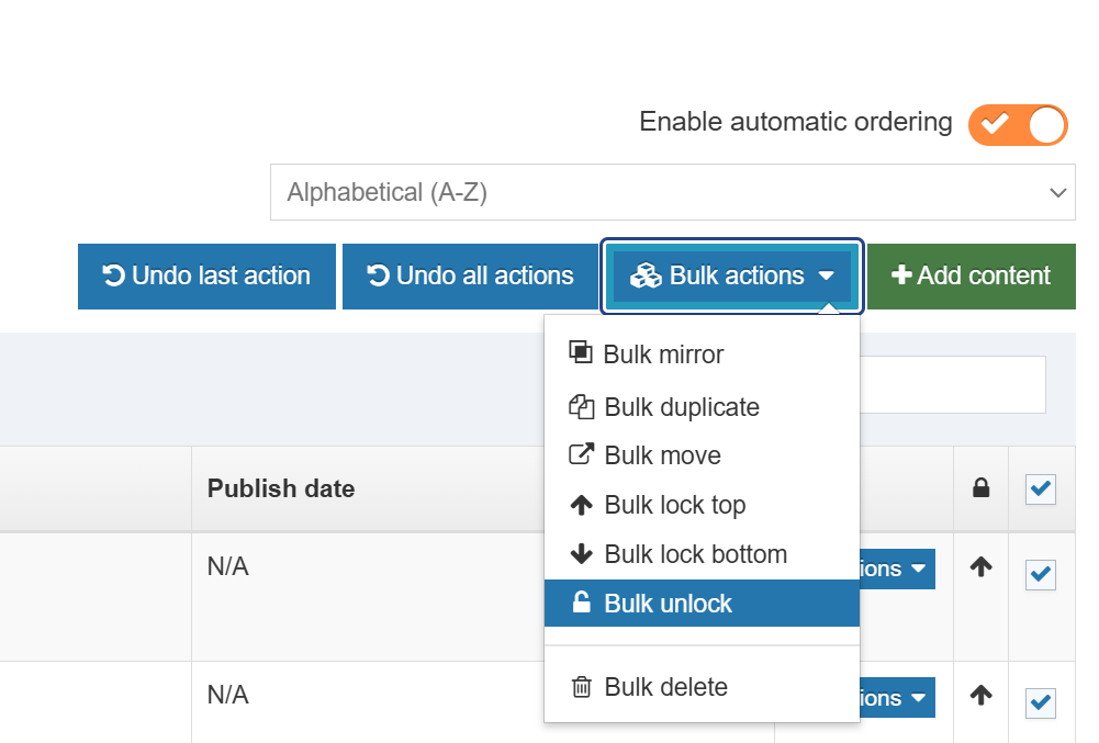This will apply automatic ordering to any new content you add. To apply this to existing content you need to bulk select all the content and then click Bulk actions and then Bulk unlock as shown below.