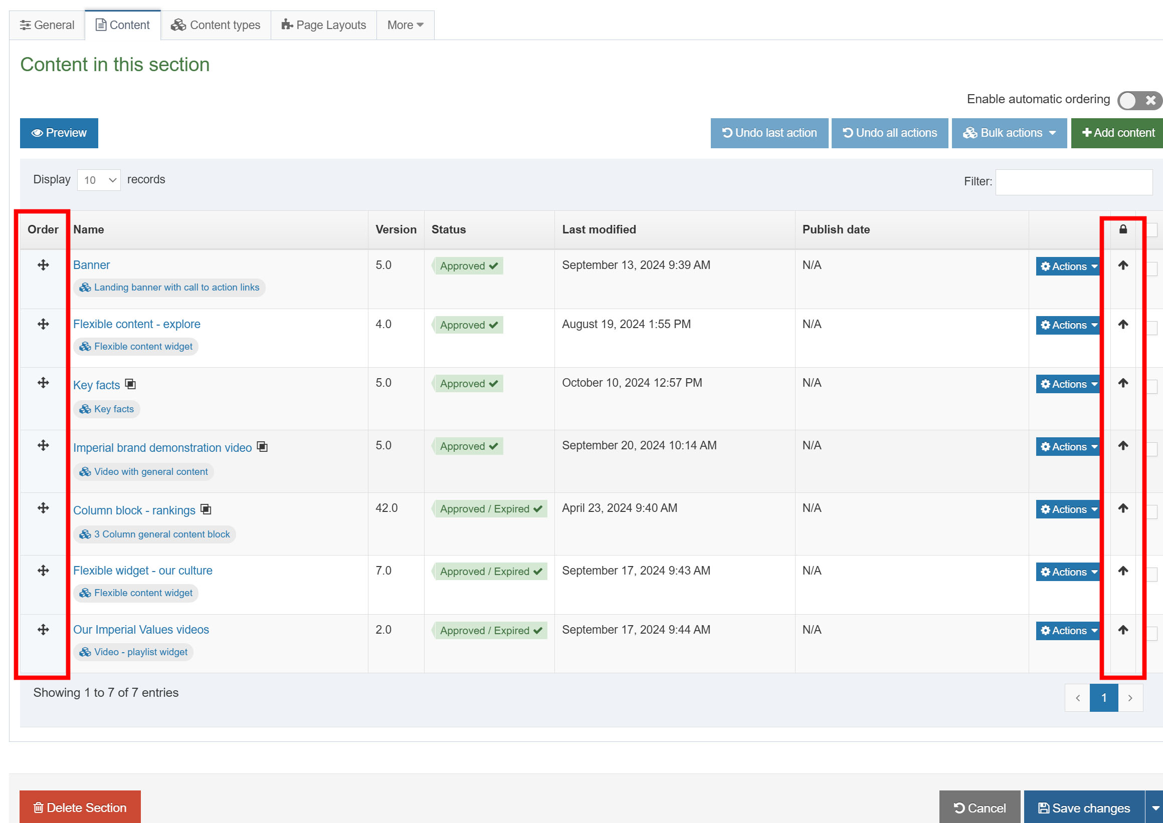 3. The section will open and you can now see the content types that have already been added. By default, content types will display on a webpage in the order they have been added to the content management system.