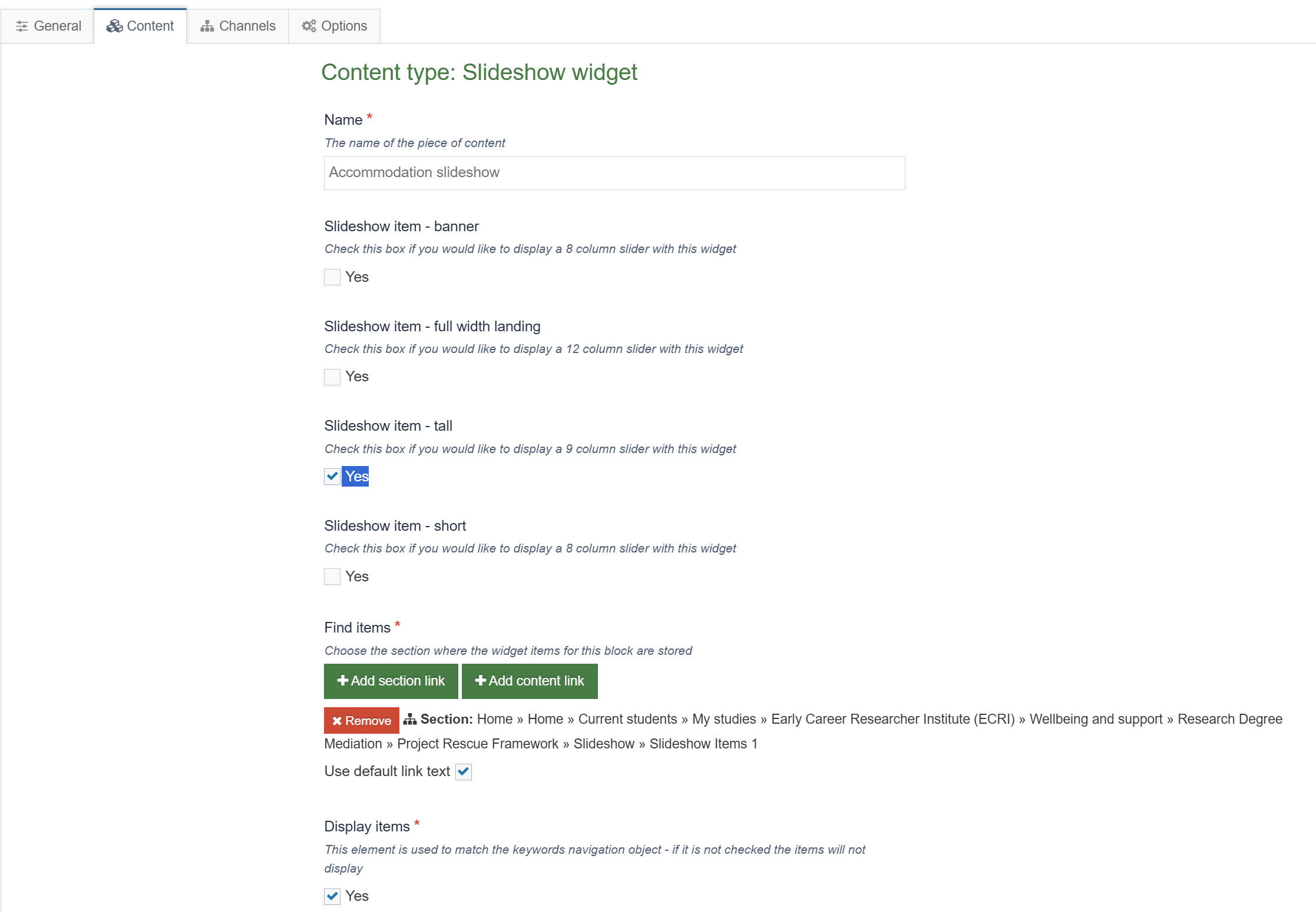 | Find items* | This is how you link the slideshow items created earlier to this slideshow. Click Add section link and select the sub-section where you added your Slideshow item - full width landing items in my example it was 'Slideshow 1 items' |