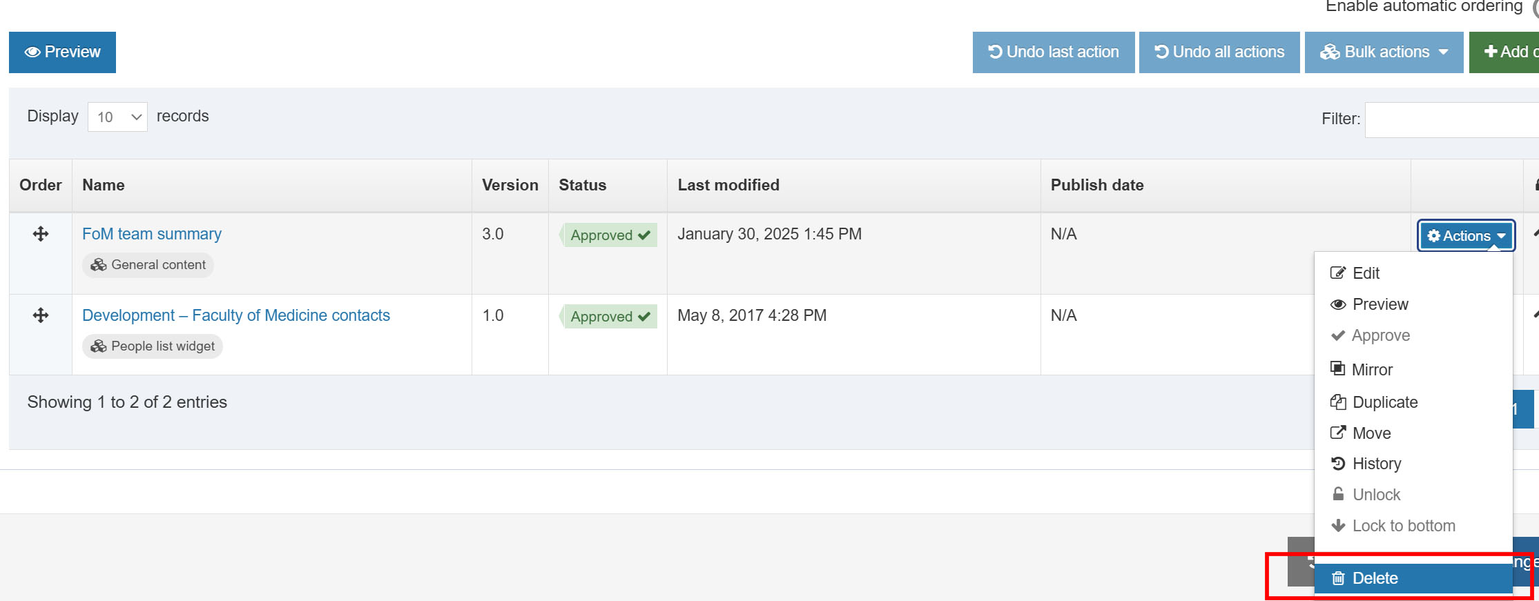 2. For the piece of content you want to delete, then click the blue Actions button and select Delete.
