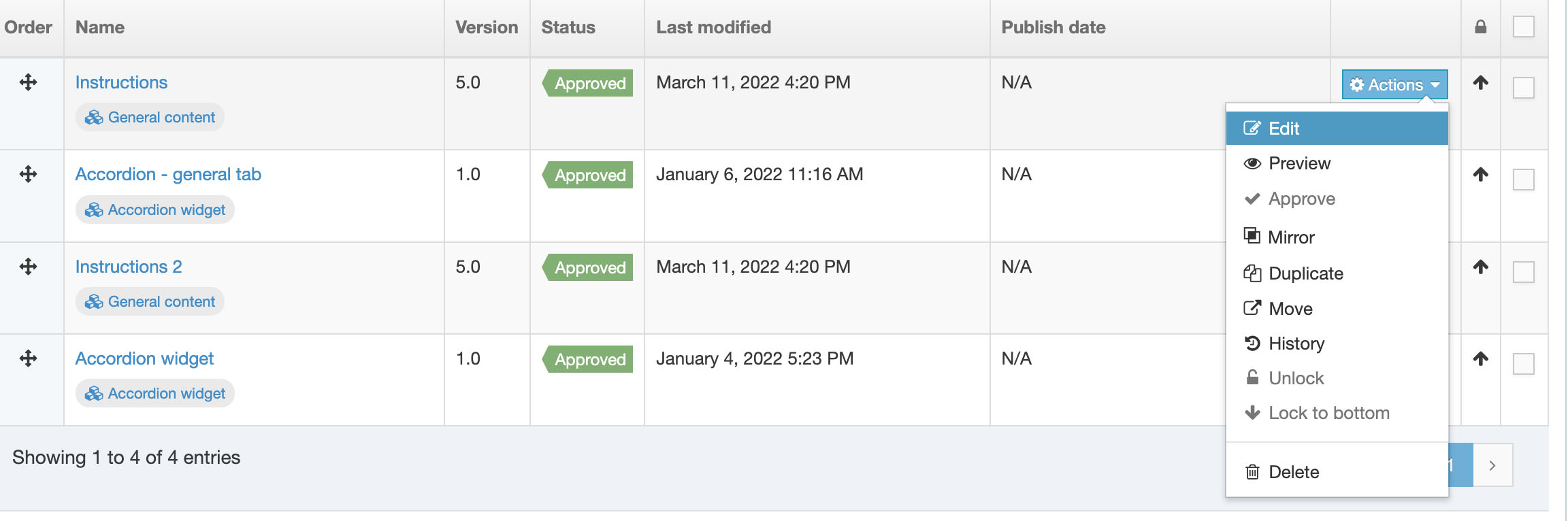 1. Navigate to the section where the content is and click on the blue Actions button and select Edit content.