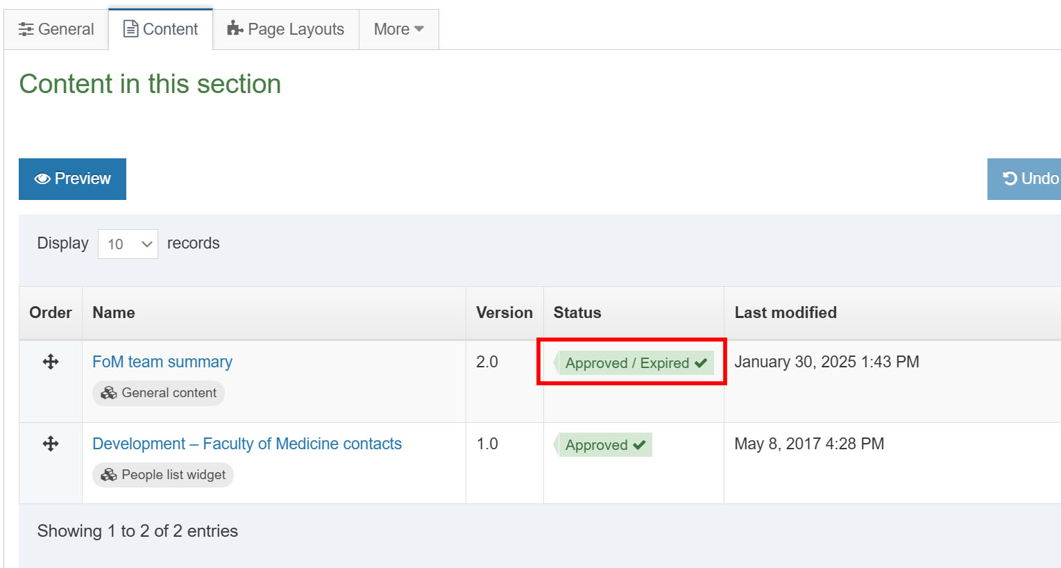 Once this time has passed, the content will appear on your list as 'Approved / Expired'. At next publish of the section/page, it will disappear from your page.