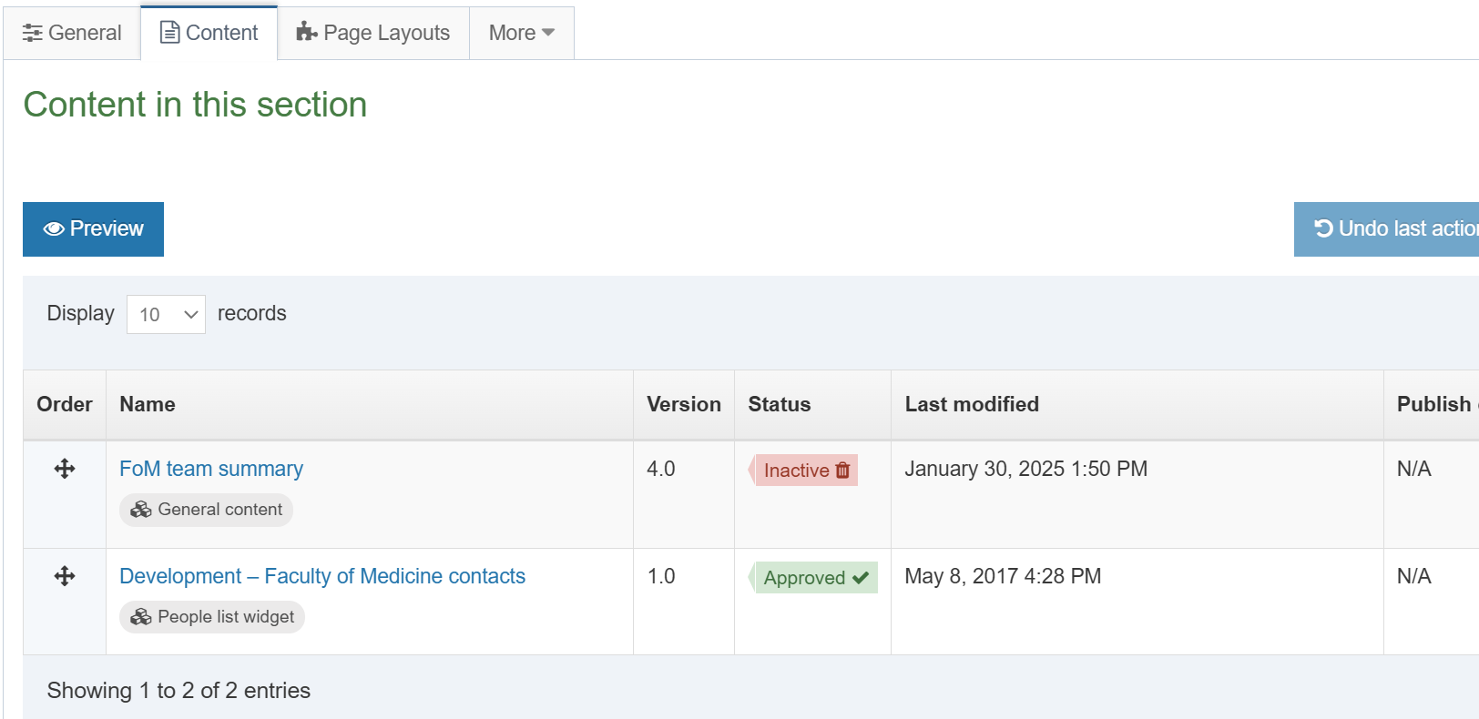 Your content will then be marked as Inactive (see below). and will disappear from the web page when you next publish the page. It will then be added to the purge queue and permanently deleted on the next Monday morning.
