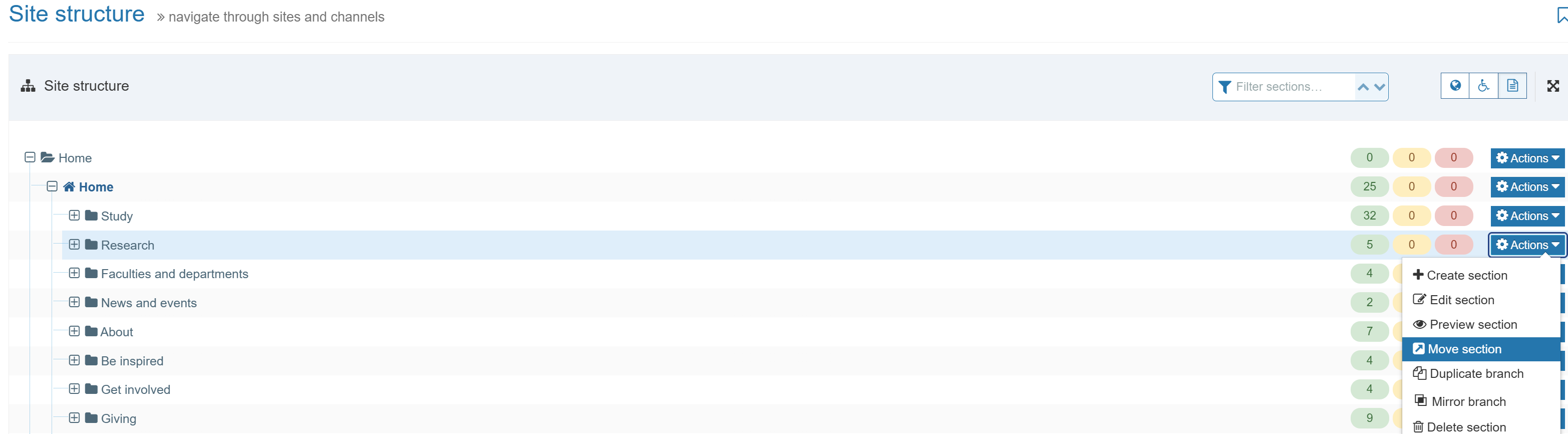 2. Click on the blue Actions button and select Move section