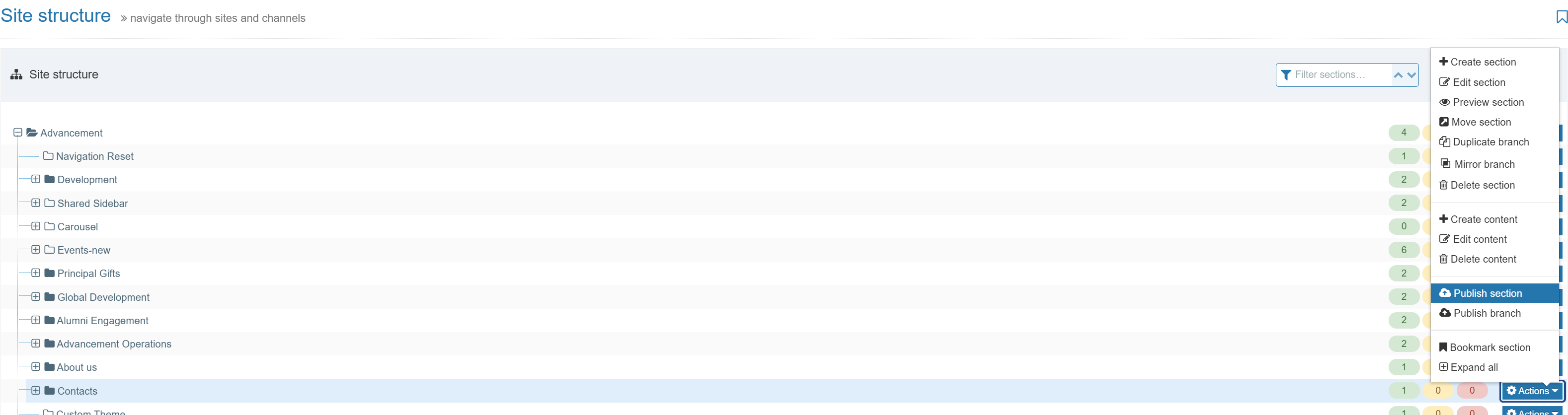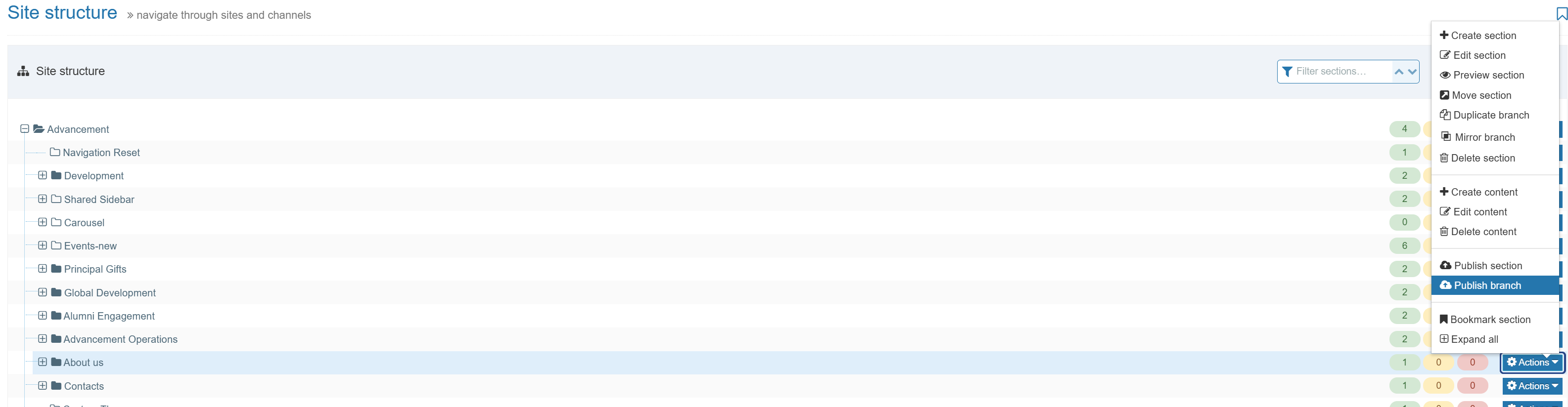 Important note: If you want to publish a large branch e.g. over 50 sections (pages), please try and leave this for the overnight site-wide publish if possible. This is because publishing works via a queuing system, so a large publish job like this may delay other editors in the College who are publishing single pages.
