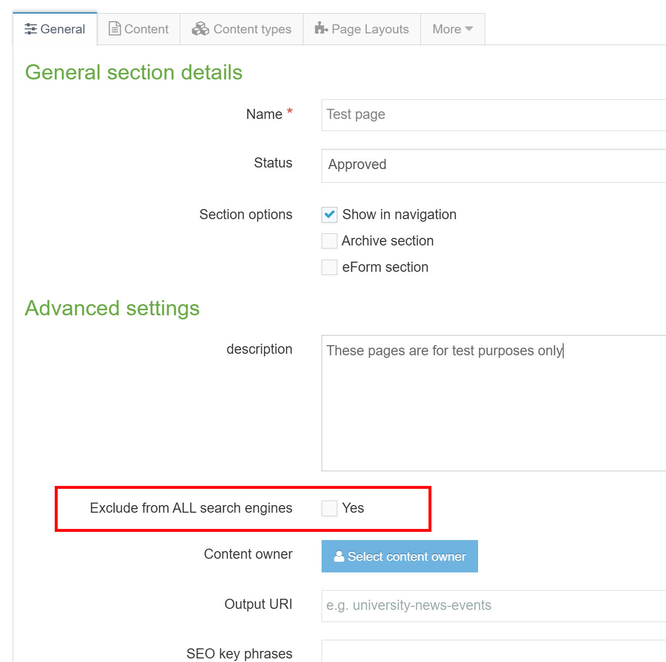 Exclude from ALL search engines – if this option is ticked, then all search engines, including Google, Bing and the new Imperial website search will ignore the page entirely. This means it will not appear in search results.