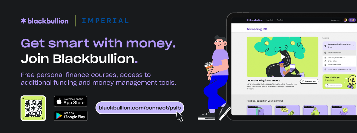 Blackbullion is a digital financial education platform designed to provide you with money skills for life. Blackbullion is free for all Imperial students and gives you access to a full range of online learning pathways and tools to help you manage your finances and build yourself a better financial future.