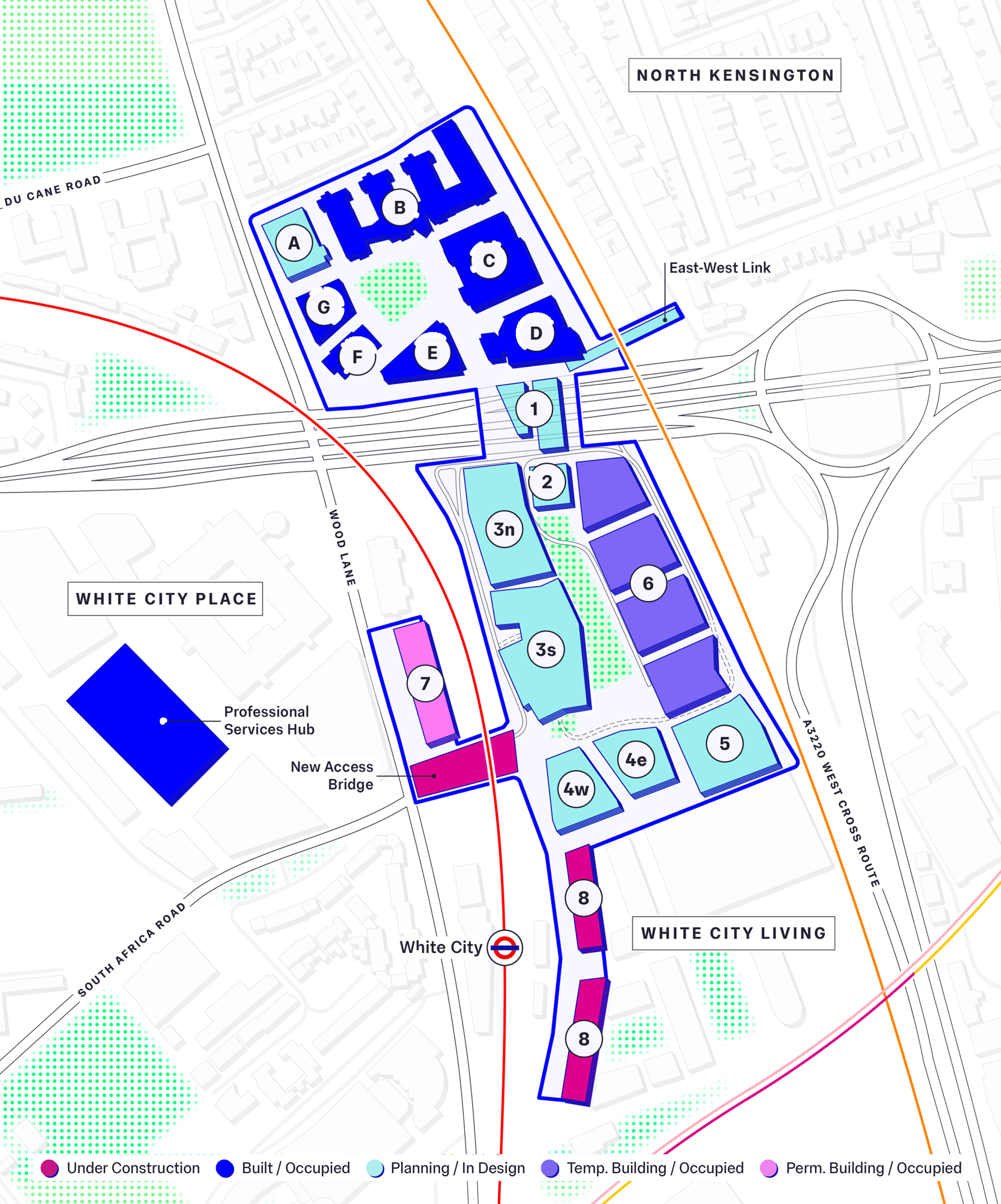 The White City Campus masterplan. This shows development zones located south of the Westway which were approved by London Borough of Hammersmith & Fulham in 2021.